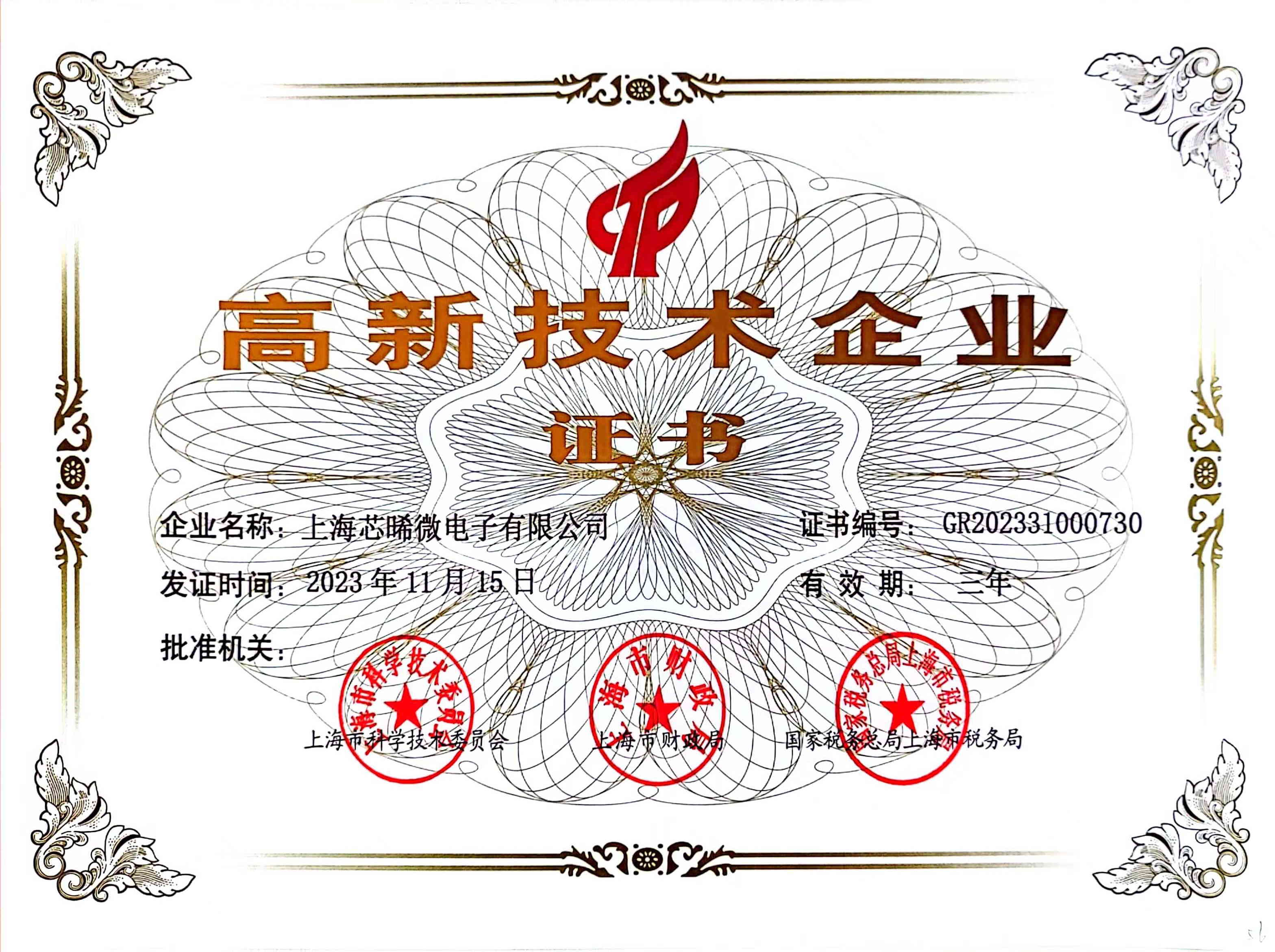 喜讯!根据国家《高新技术企业认定管理办法》和《高新技术企业认定管理工作指引》的相关规定,上海芯晞微电子有限公司被认定为高新技术企业。 近日,公司收到了由上海市科学技术委员会、上海市财政局、国家税务总局上海市税务局联合颁发的《高新技术企业证书》。